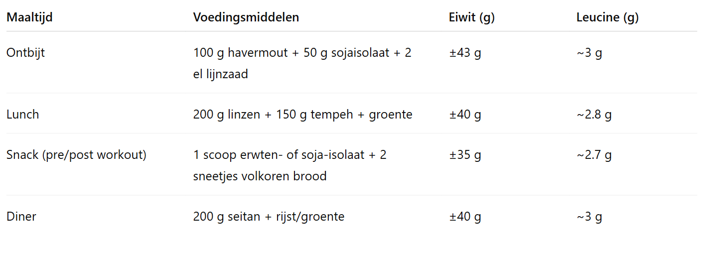 Deze opbouw garandeert voldoende eiwit én leucine-triggers door de dag heen, wat zorgt voor een constante anabole stimulans.